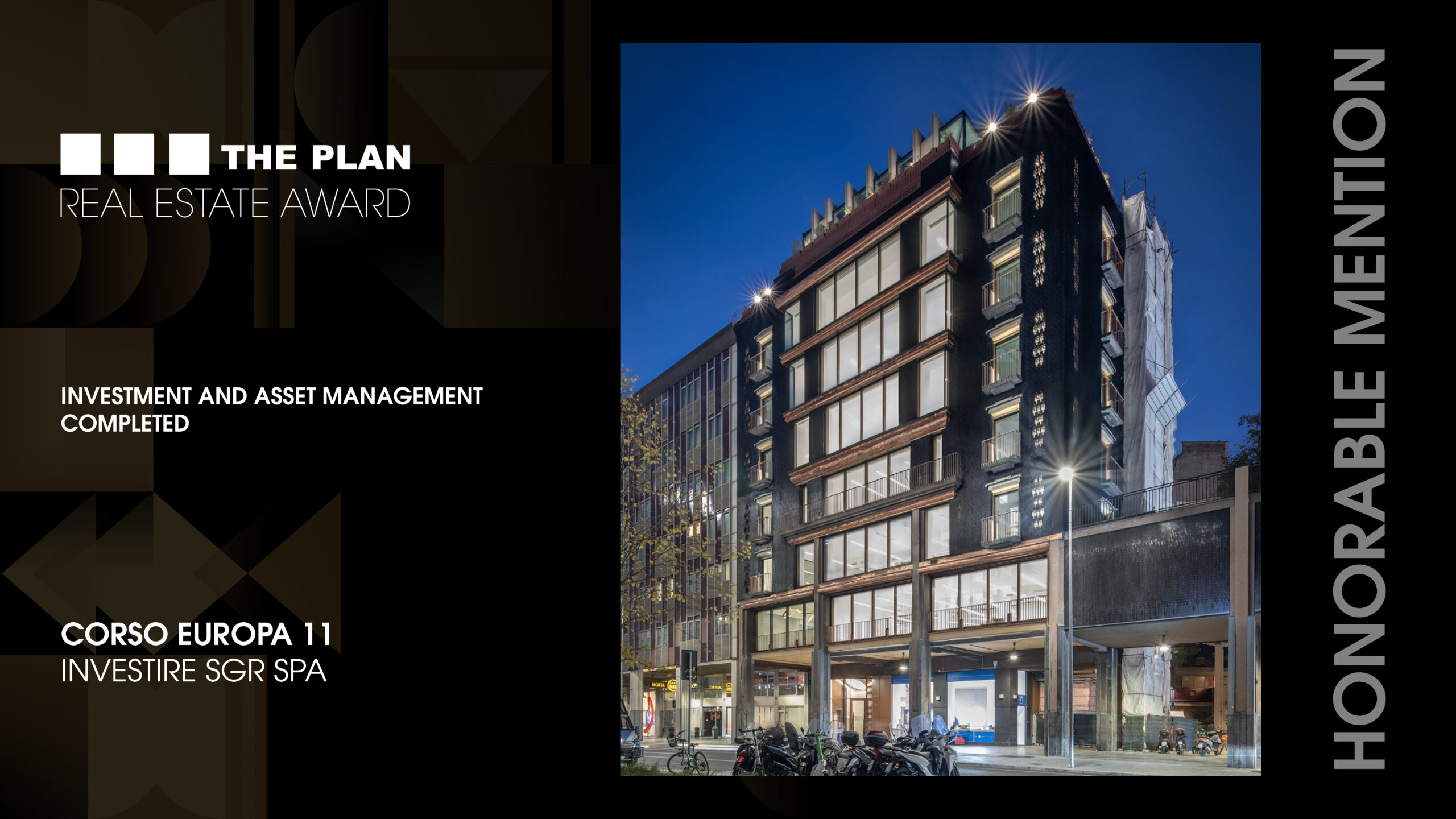 Corso Europa 11 ottiene una Menzione d’Onore al THE PLAN Real Estate Award 2025. Il progetto, sviluppato per InvestiRE SGR, è stato premiato nella categoria Investment and Asset Management – Completed per la capacità di generare valore duraturo attraverso una strategia integrata di riqualificazione architettonica, sostenibilità e gestione dell’asset.